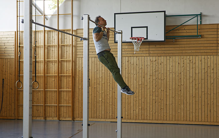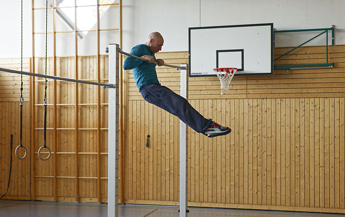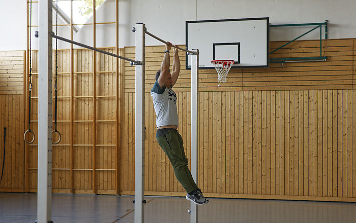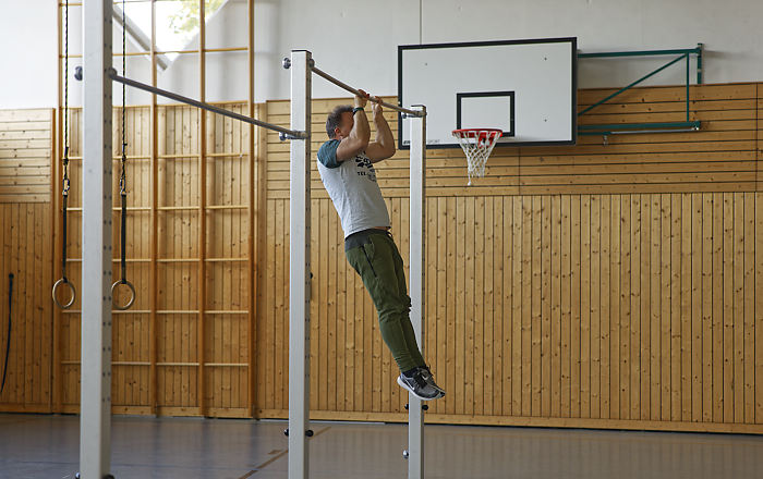 Ausführung: An die Stange ziehen, bis mindestens das Kinn über der Stange ist. Optimal wäre bis auf Achselhöhe. Danach wieder kontrolliert absenken. Wenn die Aufwärtsbewegung noch zu schwer ist, dann z.B. mittels einem Kasten wieder auf Achselhöhe nach oben klettern.