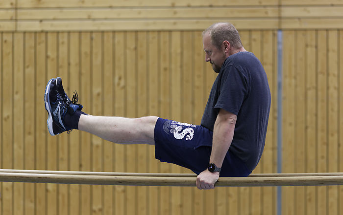 Vorbereitung: Am Barren eine Stützhaltung einnehmen. Beine gestreckt in die Horizontale bringen.