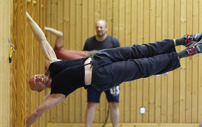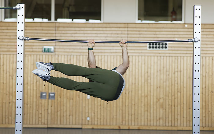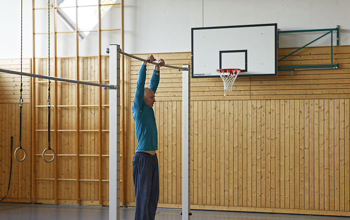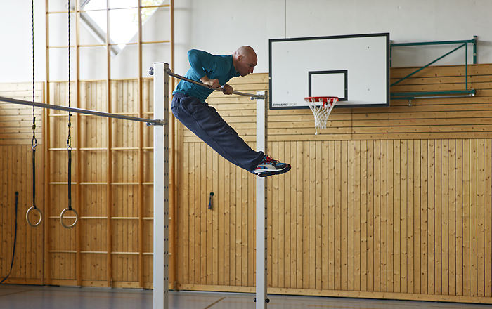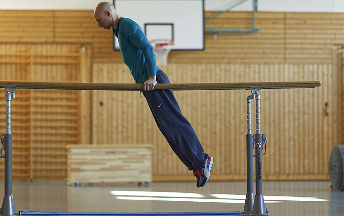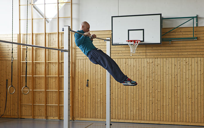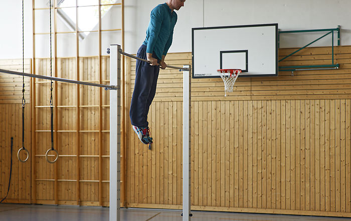 Vorbereitung: Klimmzugstange nicht komplett umgreifen, sondern die Handballen nahe am Handgelenk von oben auf die Stange setzen. Je nach Flexibilität der Handgelenke, die Stange soweit wie möglich mit den Fingern umgreifen oder eine lockere Faust bilden, die auf der Stange ruht. Dabei beachten, dass das Handgelenk sich über der Stange befindet.