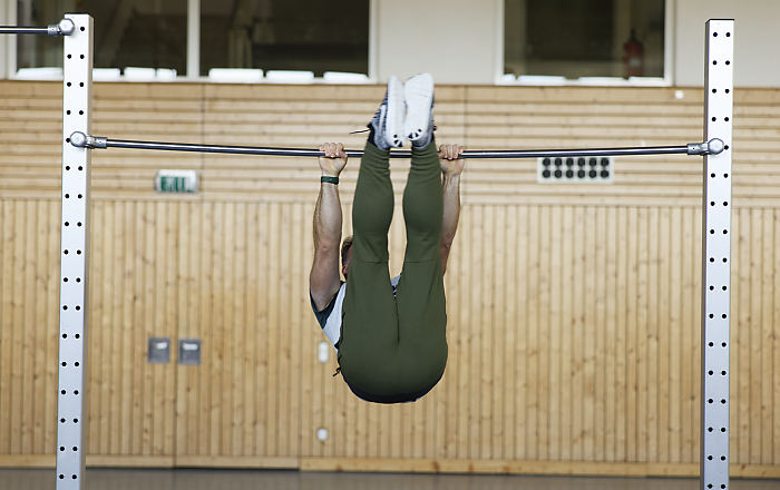 Vorbereitung: Schulterbreit an eine Klimmzugstange hängen. Beine gestreckt bis nah an die Stange heben.