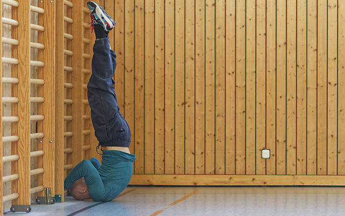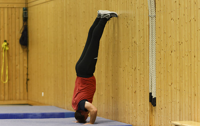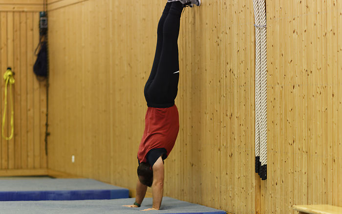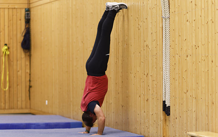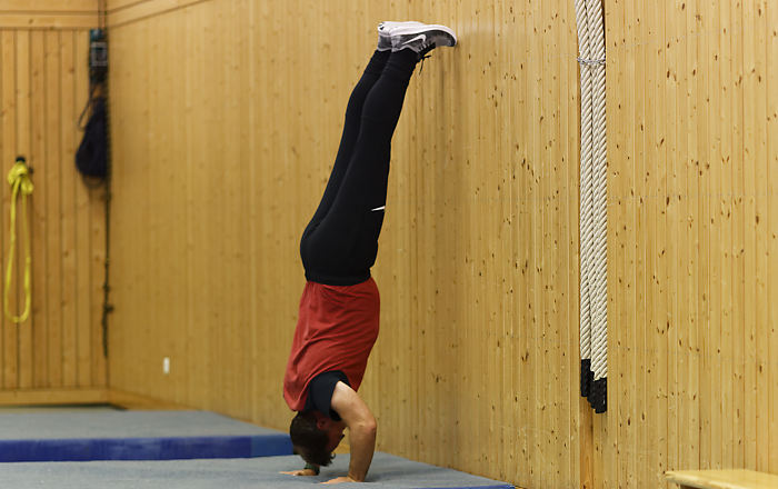 Vorbereitung: Handstandposition an der Wand einnehmen.